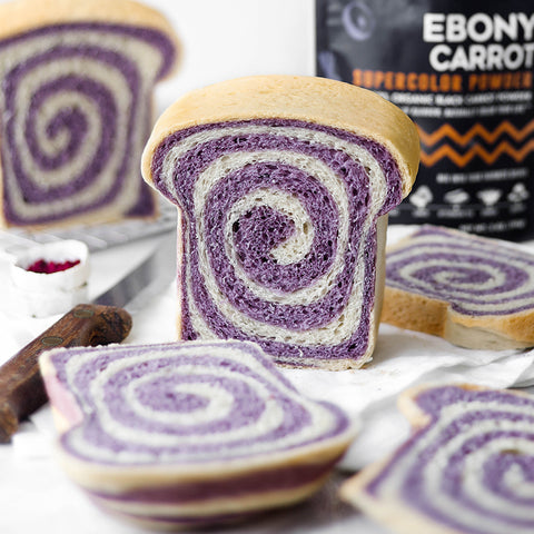 Homemade bread hot & fresh out of the oven forever and always will be our favorite and this is the definition of comfort food. The smell alone will captivate a large crowd and this impressive soft & tender with the most unbelievable hypnotizing swirls throughout will bring a touch of fun to every meal! There is nothing quite like this. So satisfying and easier to make than you might think. Only requires a handful of basic including Suncore Foods® Ebony Carrot Powder to achieve the majestic hues of purple. Spread with soft butter, peanut & jam, or your favorite toppings and there’s nothing better!