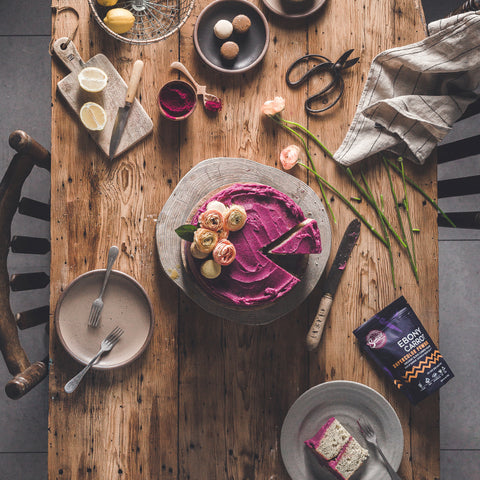 Happiness starts with a slice of this delicious Lemon Poppyseed Cake with Ebony Carrot Buttercream Frosting. Serve this truly stunning and moist cake at your next gathering, and your guests will be begging you for the recipe. It's loaded with poppy seeds for that delightful crunch and a hint of lemon, enrobed in a rich, deeply romantic, creamy buttercream frosting. Delicious! Recreate this dreamy cake with Suncore Foods® Ebony Carrot Powder and add some color to your table. Eat, sleep and stay happy.
