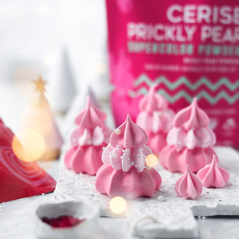 Wishing the most joyous Christmas to everybody and loved ones! May your day be merry and bright! On our agenda today is to be surrounded by love and snuggle up by the tree with a mug of hot cocoa--or cute little Christmas Tree Meringue Cookies dressed up in pink! With darling shades of pink made from Suncore Foods® Cerise Prickly Pear Powder sifted with Suncore Foods® Ruby Red Radish & Red Beet Powders, these crisp meringues melt the instant they hit your tongue. Because some people are worth melting for. Happy Holidays to one and all!