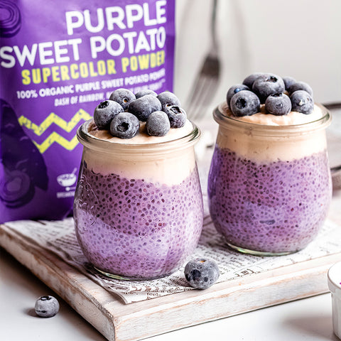 1. In a jar, mash the cooked yam, then mix in the nut/seed butter and milk. Whisk in Suncore Foods® Black Chia Seeds and sweeten to taste, then add enough Suncore Foods® Purple Sweet Potato Powder to your desired color.