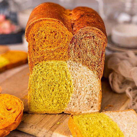 Happiness is biting into bread! Make breakfast fun and whimsical with this beautiful Quadrant Rainbow Loaf! Top it off with your favorite spread and fuel your day with happiness. This lovely, welcoming, warm colors hue is made with Suncore Foods® Pink Pitaya, Red Beet, and Yellow Goldenberry Powders. This loaf is easy on the eyes and yummy in your tummy! Bread is love-made edible. Enjoy and start your day with a good breakfast.