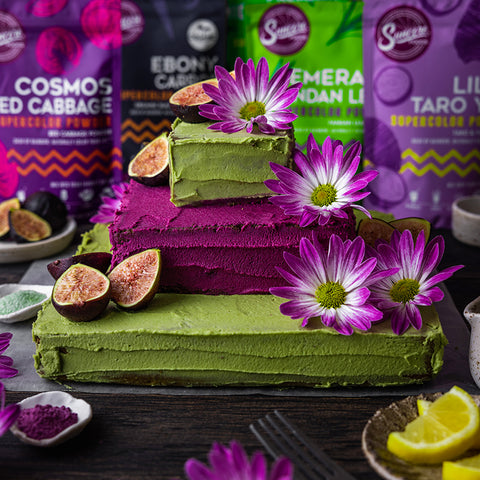 3. Buttercream — Using an electric beater, beat butter for 2 minutes. Mix in cream of tartar and vanilla extract. Mix in powdered sugar, 50 g at a time. When ready, transfer a third of the buttercream into another bowl. Combine Suncore Foods® Emerald Pandan Leaf PowderSuncore Foods® Midori Jade Matcha Powder into the larger bowl and Suncore Foods® Lilac Taro Yam PowderSuncore Foods® Cosmos Red Cabbage Powder into the separated, smaller bowl. Spread the green buttercream on the 9” and 3” cakes and spread the purple buttercream on the 6” cake, ensuring you coat the top and all sides. Set aside all cakes for 30 minutes. Place the 9” cake on a flat serving dish. Next, gently place the 6” cake on top of the bottom layer and lastly, add place the 3” cake over the middle layer.