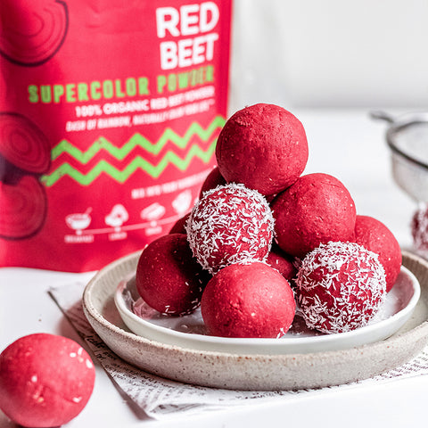 Who could resist the vibrant red velvet color? Isn't it just so blissfully pretty! The gorgeous color of these Red Beet Velvet Bliss Balls doesn't come from any artificial coloring! Oh no, it comes instead from a perfectly Suncore Foods® Red Beet Powder to create the stunning color and a pop of rich flavor!