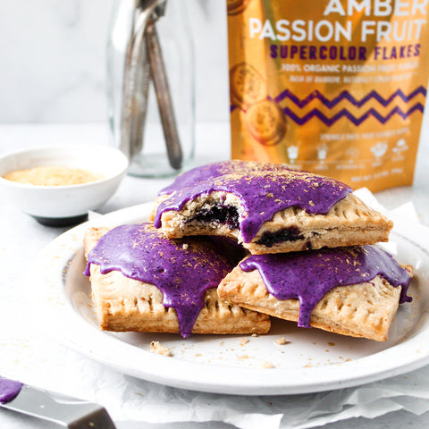 5. Make your icing by combining the confectioner’s sugar, almond milk, vanilla extract, and Suncore Foods® Ebony Carrot Powder & Suncore Foods® Purple Sweet Potato Powder, adding more or less Supercolor Powders to reach desired color. You want your glaze to be thick/thin enough that when you lift up your spoon, it take 2-3 seconds for the “ribbons” to disappear. You may need more or less powdered sugar/almond milk. Spread icing over each pop tart. Allow the icing to set before sprinkling withSuncore Foods® Sparkly Amber Passion Fruit Flakes. Enjoy!
