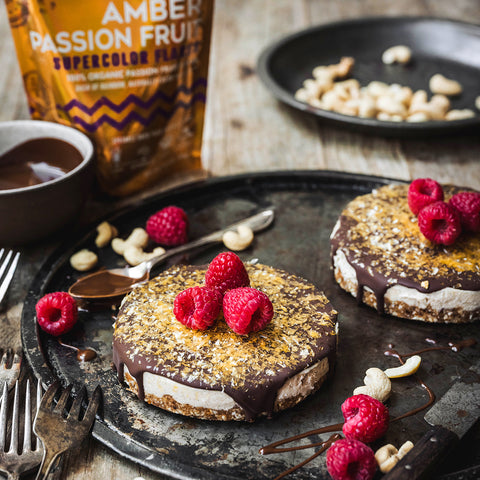 3. Chocolate topping: Melt chocolate and coconut oil in microwave in 20 second intervals. Pour over frozen cheesecake and immediately top generously with Suncore Foods® Sparkly Amber Passion Fruit Flakes.